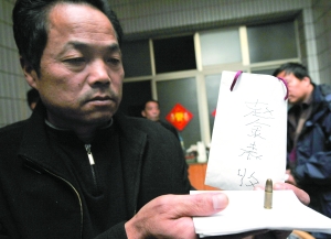 11月7日,在西安市碑林区电子城街道办事处丁家村,村主任候选人赵金表收到一“红包”,里面装有一颗手枪子弹。赵金表认为是恐吓,向派出所报案。据悉,赵金表在该村当了6年村主任。8日,该村又一次选举新村主任,赵金表又作为候选人之一参选。袁景智 摄