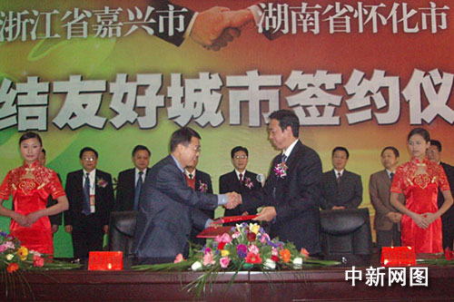 中新网怀化11月11日电(记者 邓霞)友谊的纽带将位于舞水河畔的湖南怀化和南湖之滨的浙江嘉兴紧密相连,双方今天在此间缔结为友好城市。根据协议,两地将在经济、商贸、旅游、文化等方面加强合作与交流。