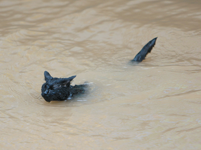 小猫抬头、翘尾游在江水中 记者 张路桥 摄
