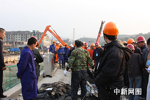 记者了解到,施救人员用水冲淤泥时,发现该遇难者头冒了出来,此人呈站立姿势,手和头露在外面。四个救援人员下去后,因为该遇难者身体大部分埋在沙石里,施救人员只好用铁锹挖,挖掘的效果并不佳。最后,防战士出动两支水枪,在两边冲开泥沙 ,下午从1点50分,一直冲到3点30分,中间冲冲停停,冲一下挖一下,反复几次后,终于将遇难者尸体弄了出来。在挖出尸体后,救援人员发现此人身体下面还有一根钢管。