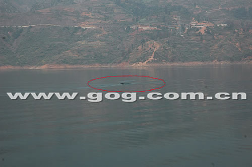 11月30日下午2:30,当考察船正在调头回行时,突然水面波涛翻滚,一个黑影从约百米远外的水底翻出,扇动着七八米长的鱼鳍一样的家伙,清澈的水面顿时浪打浪,随行的电视台记者王述慷连忙打开摄像机记录下“不明水生物”1分多钟的闹腾过程。王述慷称:“那家伙体重肯定不会低于1吨!”