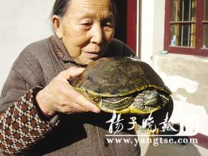 今年79岁的施老太家住高邮市郊,大龟是孙女从朋友处买来的。施老太老伴去世后一直闷闷不乐,自从有了乌龟作伴,老人开朗了许多,人也变得健谈了。
