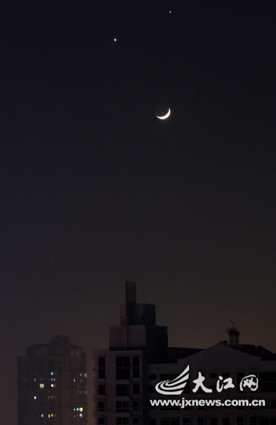12月1日傍晚6时左右开始,南昌市民抬头便能惊奇地看到罕见的“双星伴月”天文现象。