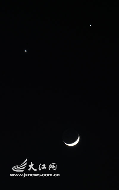 当晚,南昌夜空中最明亮的3个天体——月亮、金星和木星在西南方的低空相聚,出现“双星伴月”的天象。据江西省天文学专家介绍,出现“双星伴月”,是由于近日距离地球最近的行星——金星在运行中由西向东追赶木星。先是金星追上木星,两者相距最近,然后月亮追上木星。当三者距离最近时,出现“双星伴月”的现象。