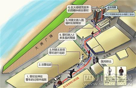 随后追至的刘德文,连看都没看一眼围墙有多高,跟着罪犯跳了下去。只听“咔嚓”一声脆响,接着一阵钻心疼痛袭向全身,右腿粉碎性骨折的他痛得躺在地上无法动弹。刘德文急忙掏出手机向110报警。见有人突然跳进大院围墙,值班门卫徐富林及院内群众立即关闭铁门。无路可逃的罪犯无奈只得钻进二单元楼顶,躲藏在一个废弃的鸽棚中。5时许,脱逃罪犯被随后赶至的法警和当地派出所民警缉拿归案——从法院门口趁机脱逃,到楼顶被重新戴上手铐,全过程约20分钟。