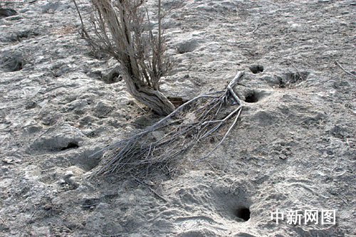 新疆准噶尔盆地西南缘甘家湖梭梭林遭人为、鼠害破坏严重。图为梭梭林中地面上多处鼠洞。作 者:王小军