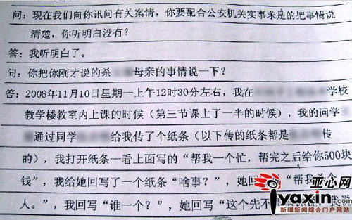 图为警方审讯笔录。内容显示莎莎和亮亮用纸条商量杀害莎莎母亲。