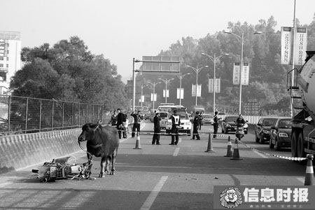 前日早上8时许,记者赶到事发现场时,一名交警正在现场指挥疏导交通,一辆破旧的摩托车拴着一头牛停在公路中央,现场被交警围了起来。