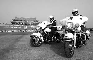 昨日上午,交警驾驶最新装备的哈雷摩托车在天安门广场发车开始首日执勤。记者 张涛 摄