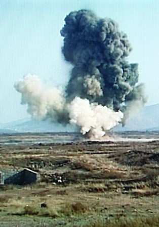 下午1点,排爆人员架设通电导线,在弹体周围放置肥皂块大小的TNT炸药,每块200克,用了50块。