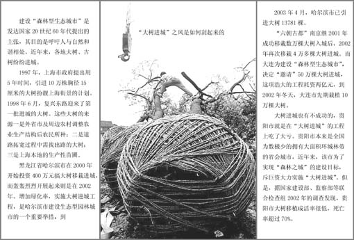 近年,伴随着“园林城市”、“生态城市”、“森林型城市”等城市理念的兴起,伴随着“广场工程”、“绿化工程”以及“道路工程”的轮番上马,一场“大树进城运动”在百姓的视线之外发起,又在监督的视线之外成为争相模仿的流行趋势。