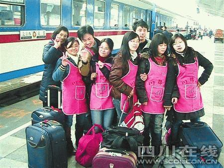 随着春节临近,北京家政市场保姆荒的情况也越来越严重。昨日上午11时许,川妹子家政公司组织的15名进京家政人员登上了开往北京的列车。保姆中有8人是大学生,其中7人是家政专业的大学毕业生,1人是因新近公司倒闭而失业的白领。明日,他们将走进北京市民的家庭,从事高端家政服务,年薪在2万元左右。
