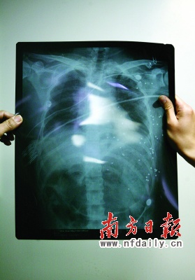 ×光片显示周双明的体内约有小弹丸百余颗。杨曦摄