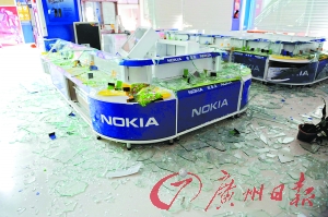 购物广场内的一个手机专卖店的柜台被砸烂。记者卢政摄