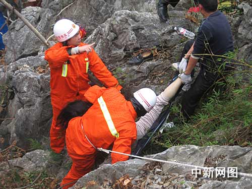 消防救援人员在山崖抢救伤员。作者:邓广福