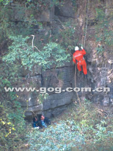 据了解,当天中午11时许,家住安龙县新安镇的徐姓父子俩在马岭河峡谷观光游览时因想拍摄角度独特的照片,冒险爬上距谷底50多米高的悬崖峭壁,因上下左右都是岩石绝壁、进退不得,被困悬崖中央。最后还是小男孩想到了119,叫父亲用手机报警求救。图为救援现场。(殷选泽 覃苗苗 韦义淳 尤立宪)
