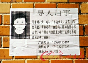 黄翠,15岁女孩,去年12月底曾在上步街一家网吧上网,此后了无踪影;邓家顺,9岁女孩,轻微智障,1月15日早晨在横滘市场走失;赵文静,12岁男孩,1月28日从横滘南胜二街家中离开,至今未归……在白云区同德围横滘市场旁的一面墙上,新近贴上去了几张寻人启事,吸引了不少街坊驻足。