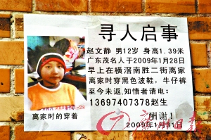 “赵文静,男,12岁,身高1.39米,离家时穿黑色波鞋和牛仔裤。”寻人启事上的信息全是最新的,照片是阿静新年穿着新衣服父亲用手机照的,走失时他穿的也是这一身新衣服,身高也是过年时刚量过的。拍照片、量身高,本来想作为儿子的新年留念,现在却登在了寻人启事上,成了父子间最后的一点记忆,赵伟峰不停地叹气。