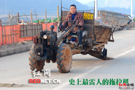 无独有偶,今年1月网友“朗州农夫”在红网论坛发布了一篇帖子名为《湖南慈利县城里拍到的“最牛拖拉机”》,照片中一男子同样也开着一辆“跛腿”拖拉机。“朗州农夫”颇为担心道“这样行车是一大安全隐患,如果只是想借此让瘫痪的车子挪个地方,倒也说得过去,要是用这样的行头搞运输,那可就得悠着点了。”(记者 周亦男)