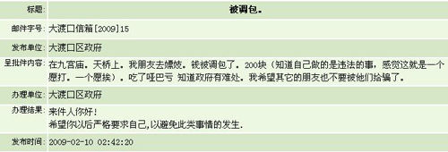 这封来信反映:在大渡口九宫庙天桥上,“我朋友去嫖妓钱被调包了,损失200块。”来信的目的是:希望政府打击卖淫行为,以让“其他的人不要被他们给骗了。”办理该来信的大渡口区政府回信只有一句话:“希望你以后严格要求自己,以避免此类事情的发生。”
