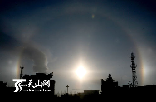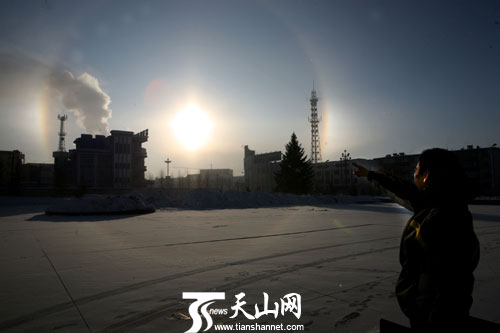 2月22日上午,在新疆富蕴县拍摄的“三个太阳”现象。当日,富蕴县天气,晴, -15 ℃ /-30℃ 。