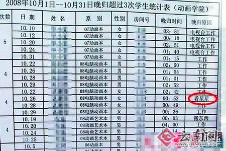近日,北影校园内张榜公布了各系晚归宿舍的学生名单,有意思的是,学校竟然还把超过3次晚归的详细原因都公布了出来。昨天,有好事网友将这些名单传到了网上。据记者观察,学生们晚归的理由五花八门,有“电视台工作”、“吃饭”,也有“拍戏”、“回家”,而动画学院一位女生的理由竟然是“看星星”。“晚归表格”一时间被无数网站转载,点击率一路攀升,而广大网友的评论似乎也并不客气。因为北影是艺术院校,加上娱乐圈给人的感觉是鱼龙混杂,很多人的矛头直指艺术院校学生的素质。