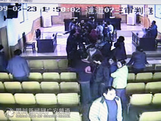 据了解,2月23日下午,广安市中级人民法院刑庭在华蓥市人民法院对广安市人民检察院提起公诉的被告人杨甲、杨乙、杨丙三人抢劫、故意杀人一案进行公开宣判。法官宣判完毕后,三被告人准备在宣判笔录上签字并领取判决书时,被告人杨甲的家属周某等人在旁听席上开始大声叫嚷,并授意杨甲不签字。
