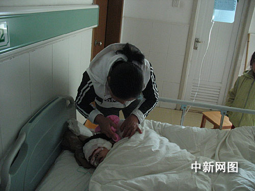 陈尚琼老人稍清醒些,但也只能躺在床上,还不怎么能说话。刚刚赶来的女儿看着病床上满面伤痕的老母亲心疼不已。