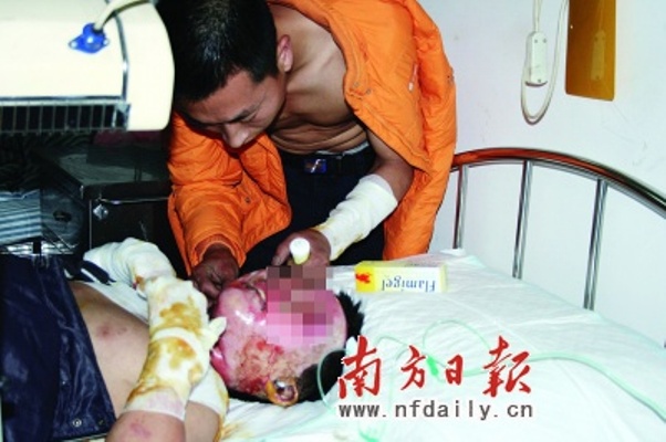 还来不及惊叫,母子俩周身便被大火包围。离开不到半小时的父亲想不到,家中一切已付之一炬。他当然来不及多想,立即将衣服正在燃烧的妻子抱到水池边,接过水直接泼向妻子,之后是9岁的小中林。消防车和救护车很快到来,火势得到控制,而这一家三口也被送到武警医院。