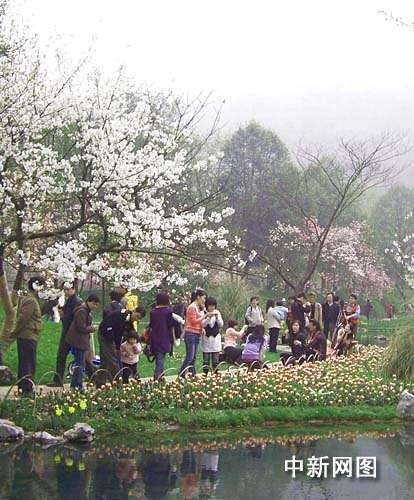除了郁金香,太子湾公园的樱花也颇是上照。在樱花坡,穿着拽地长婚纱的准新娘小叶笑得一脸幸福,她告诉记者,这种人在花中走的感觉太浪漫了,西湖三月的风光实在是让人陶醉不已。(完)
