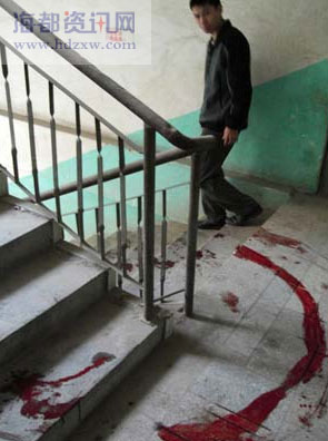 记者赶到现场时,事发的四楼宿舍里,一大摊血迹从楼梯的台阶一直延伸到一楼的大门。丰泽公安局大批民警赶到现场和东南医院盘问相关人员。