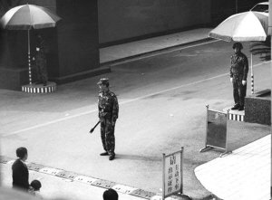 21日晚,“3·19”抢枪案件发生地某驻渝部队门岗,原本只有两名哨兵站岗值勤的部队大门前,值勤人数已经增加到了5人。门岗前的马路上,依旧人来人往,几个摆卖烧烤和水果的摊档前,不时有顾客光临。
