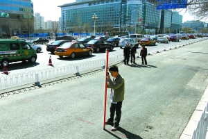昨日12时许,西单文化广场前的长安街非机动车道两头出入口,已经被拉上警戒线,交警及协管员指挥过往非机动车,由广场人行道绕行。警戒线内,非机动车道上一面积近40平方米的路面轻微凹陷,形成一个明显但弧度不大的低洼处。柏油路面上,工作人员用喷漆标记了沉降范围,以及需要进行勘测的监测点。
