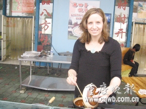 白皮肤、蓝眼睛的金发少妇车凯茜30岁,是南岸洋人街“再回手”饺子店老板娘,来自加拿大。这个店,是车凯茜和老公郑云飞爱的“加油站”。