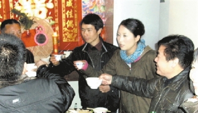 马艳霞和童利祥是3月2日举行的结婚仪式,贴在马艳霞娘家大门上的一副对联仍然鲜艳。马艳霞的父亲马双俊高兴地给记者念对联:“爱情同劳动美丽,青春靠知识闪光”。