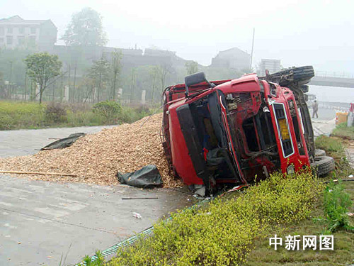 中新网长沙4月17日电(雷坤平 肖前辉)17日上午,一辆超载的大货车在驶入邵(阳)怀(化)高速公路安江服务区时,因驾驶员疲劳驾驶操作失误,导致大货车侧翻在服务区入口处。