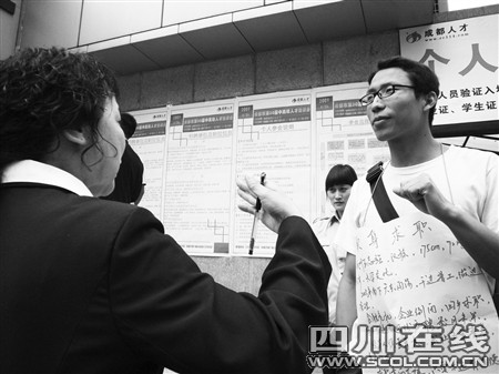 “求职意向不限,只要不违背道德和法律;出让5年青春,每年年薪10万。”想要求职,却又不带任何相关证件,只靠胸前挂着的“卖身求职”的告示,出现在招聘会门外,寻求用人单位和他联系。昨日,宁夏街中国成都人才市场正举办一场人才招聘会,而招聘会大门外,一名胸前挂着“卖身求职”告示的年轻人,却引来周围群众纷纷驻足。对于年轻人这种行为,用人单位看法不一。