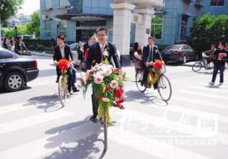 记者了解到,新郎和新娘均是白领阶层,婚礼搞几辆豪华车是没有问题的,可两家都住在应天大街,两个小区离得比较近,在研究婚车线路时,觉得车队开不了多远就到了。而新娘曾表示,她看过《甜蜜蜜》这部影片,女主角张曼玉坐在自行车上依偎在男主角黎明的身后,那种甜蜜浪漫无与伦比,在她认为这种感觉就是最浪漫的。(任国勇)