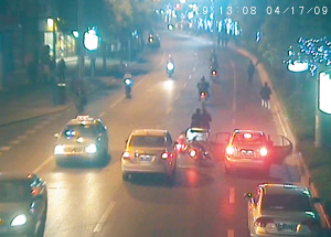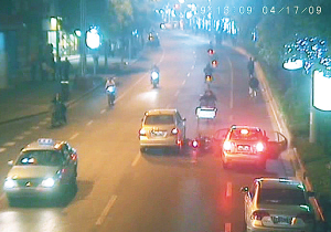 从回放的录像中,记者清楚地看到,在非机动车道上,违章停放的尼桑车前方几米处,曾出现过一辆浅色私家车。该车刚停下不久,骑车人的身影就出现在了画面中,只见右后侧车门先打开,有个大约六七岁的长发小女孩下了车。几乎与此同时,左后侧车门也毫无预警地打开了,正巧刮擦到了猝不及防的助动车,骑车人瞬间倒地,瞬间的突发情况以致后续紧跟着的颐达车尽管慢速行驶却也根本无法避让,硬生生压过骑车人。