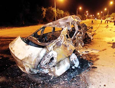 事故发生后,记者接报赶到现场发现,被撞后严重扭曲变形的“天籁”小轿车,已烧剩一副骨架,车尾部仍在不停地冒烟,现场弥漫着一股刺鼻的焦臭味;而离该车尾部左边约七八米外的双黄线旁,横卧着一具身穿红色上衣的男子尸体;该车内右侧座位上也有一具已被烧焦的尸体。