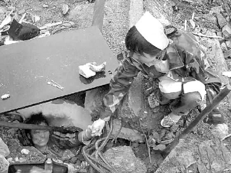 废墟里,一个少年被扭曲的钢筋、预制板埋着,眼神里流露出对生的渴望;废墟外,一名穿凉鞋的女护士,左手提着一袋血浆,右手和少年的左手紧紧握在一起。地震中,这张照片被网友们称为“汶川大地震中最感人的十大镜头”,照片中的女护士顾云仙,被网友们称为“最美女护士”。
