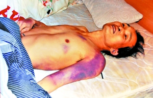 江国贵的妻子说,江国贵死后,身上的伤痕才显现出来,“到处都是,很恐怖”。