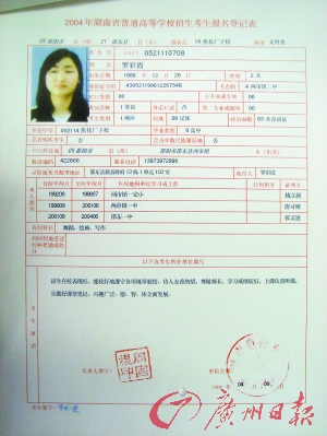 记者昨日查阅假罗彩霞当年被录取的纸质档案。这份编号为“520821102”的《湖南省2004年普通高等学校录取新生名册》上,“罗彩霞”的考生号为“04430521110708”,批次为“第二批”,录取形式为:“计划:国家任务定向”,上面还有罗彩霞的身份证号等考生基本信息。这份新生名册的左下方加盖了“湖南省普通高校招生委员会录取专用章”的大红印章。黄开烈说:“我们不能随便怀疑这个考生是假的。我们每年招6000多名学生,每个都去怀疑是不可能的。造成假罗彩霞事件的本质问题和根源问题不在贵州师大。他们造假能做到这一步,也是我们无法想象的。”(文/图 特派贵阳记者文远竹)
