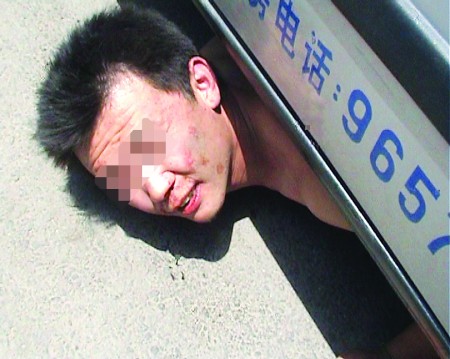 之后一个多小时的时间里,任凭警察如何劝说,小伙死活不肯出来(图①)。前辆出租车的司机给他买来了矿泉水表示道歉,他依然不依不饶。最后,热心市民抬起出租车的一边,另有几位费尽力气,才将小伙抬了出来。