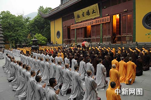 中新网杭州5月12日电(记者 柴燕菲 见习记者 周翌)一年前的今天,巴蜀大地一声长叹,举国旗半落以致哀,笛长鸣以悲怆。一年后的今天,巴蜀大地重获新生,如凤凰涅磐。一年来,汶川的阵阵喘息,步步前进都牵动着全国人民的视线。2009年5月12日16时30分,杭州市佛教界各大寺院300余僧众会聚千年古刹灵隐寺,隆重举行汶川大地震一周年祈祷法会。