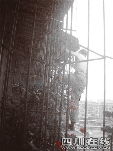 昨日早上6点过,成都站北东路144号居民陈先生被一阵嘈杂声惊醒,“有贼娃子上来了!”楼下扫地的万婆婆大声呼喊。陈先生走出卧室,赫然发现书房的防护栏外,站着一个身穿黑色外套的中年男子……