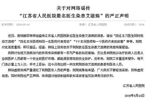 昨日,就网上流传的“江苏省人民医院4把主刀同时感染艾滋病,美女医代浮出水面”传闻,江苏省人民医院在其网站公开发表声明,称此事纯属谣传。
