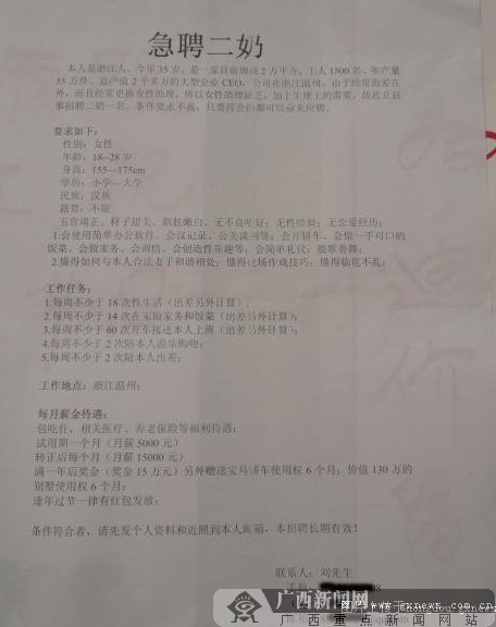 应聘“二奶”者月薪高达1万5 逢年过节发红包