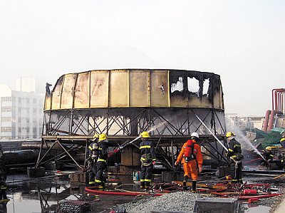 在救火过程中,附近一在建的高层建筑有多名工人仍在施工。当地政府初步怀疑,起火和这一高层建筑施工有关。“施工电焊会冒出火花,被风吹到冷却塔上,引起大火”。起火原因正在进一步调查中。(记者黄玲摄影报道)