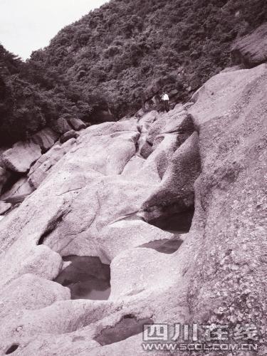 专家推测,冰川运动在这里形成了一个很大的冰床,冰水滴水穿石,形成一个个圆圆的冰臼。(华西都市报 张发政 高志农)